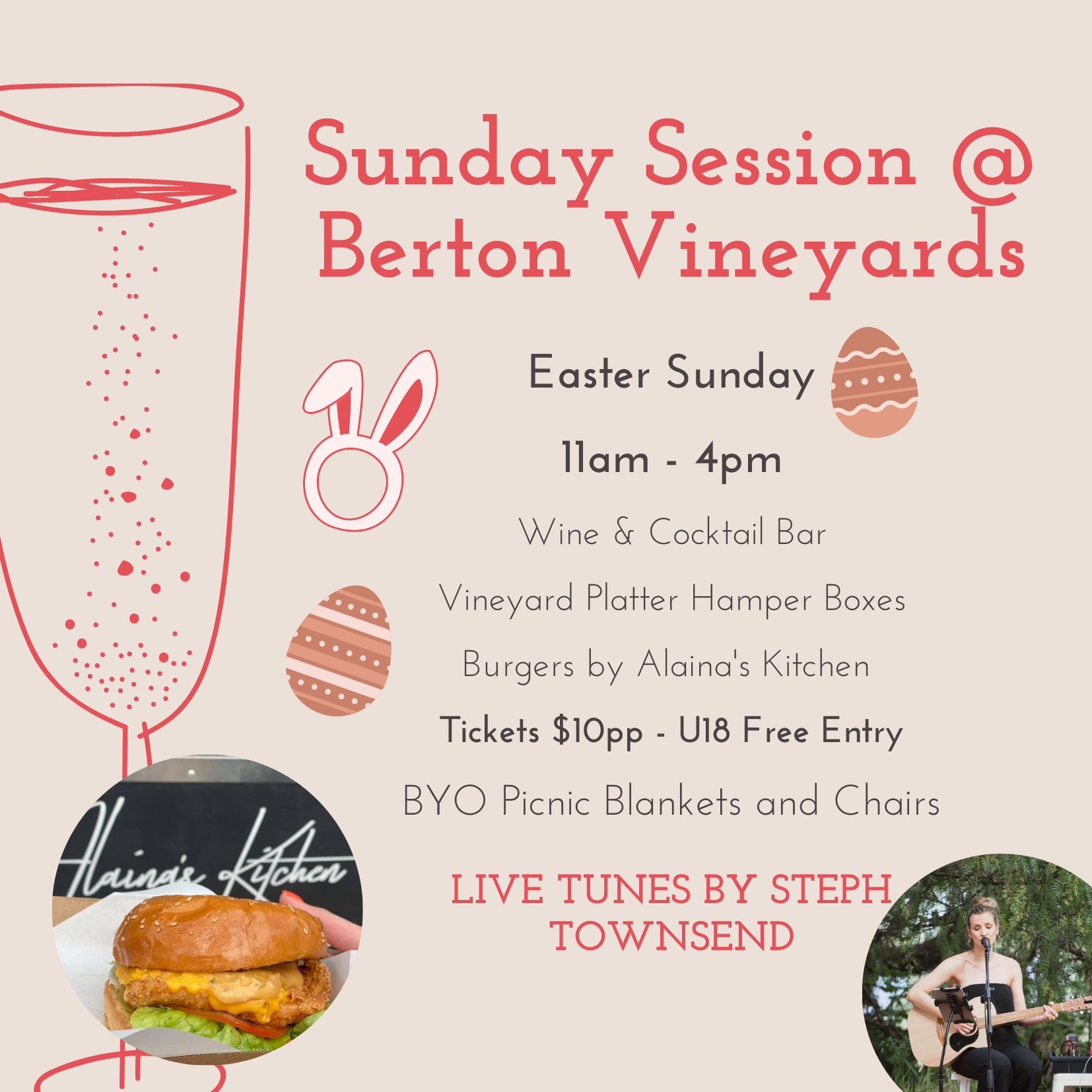 Enjoy Easter Sunday at Berton Vineyards from 11am-4pm. Alaina’s kitchen & vineyard platters available, with Steph Townsend providing the tunes.